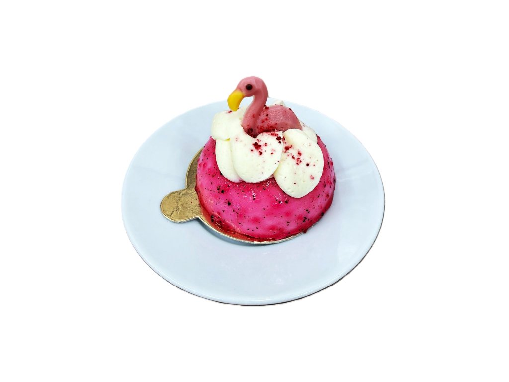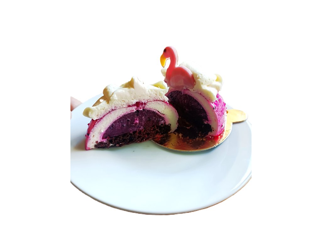 ZÁKLADNÍ SLOŽENÍ: dezert s pěnou z bílé čokolády a yuzu. Uvnitř dezertu se skrývá ještě vklad z dračího ovoce.